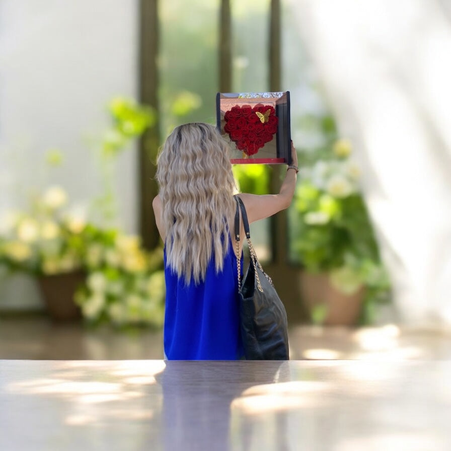 Stunning 13.5'' x 13.5'' luxury preserved roses heart box with 19 eternal roses, mirrored and acrylic lid. Perfect romantic gift that lasts years. Shop premium preserved roses arrangements today.
